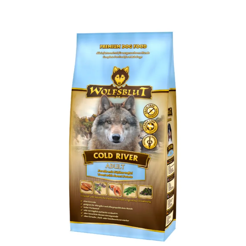 Formuła Wolfsblut COLD RIVER to wyjątkowa sucha karma i unikalna kombinacja roślin leczniczych z wody, łąk i lasów. Receptura karmy Wolfsblut COLD RIVER łączy potrzeby pokarmowe naszych psów z tymi ich przodków wilków. Menu przodków naszych psów składające się głównie z mięsa i ryb było uzupełniane owocami lasu i stepu.