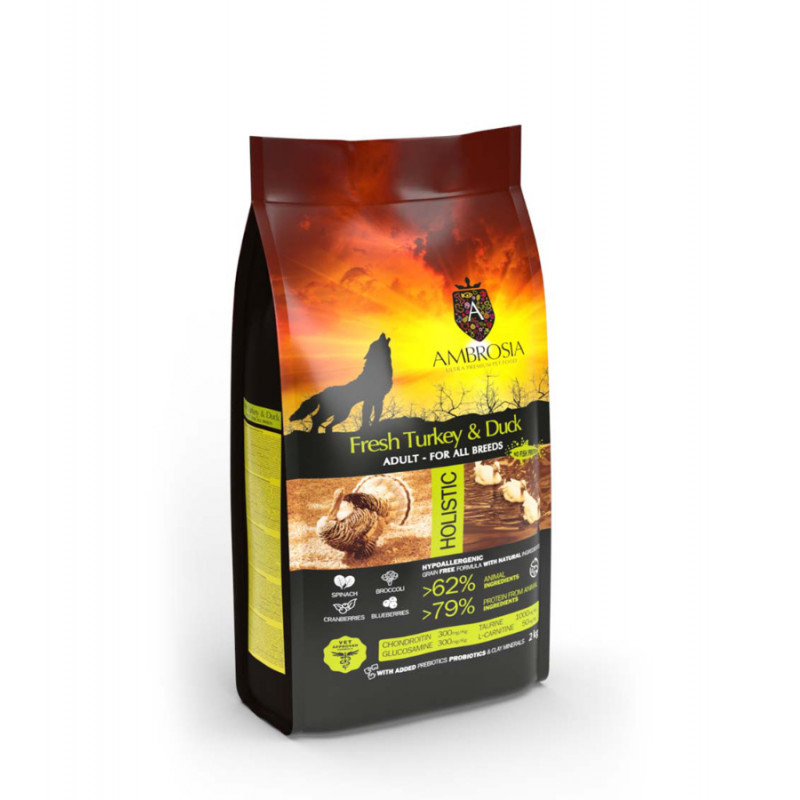 Karma sucha dla psa Ambrosia Świeży Indyk i Kaczka to holistyczna, hipoalergiczna, bezzbożowa karma dla psów z podwyższonym poziomem glukozaminy i chondroityny, aby pomóc w utrzymaniu zdrowia stawów. Nasz tłuszcz drobiowy jest oczyszczony, a to oznacza, że nie wywołuje alergii. Zawiera świeżego indyka i suszoną kaczkę w połączeniu z wyselekcjonowanymi owocami i warzywami dla uzyskania nieodpartego smaku i aromatu!
