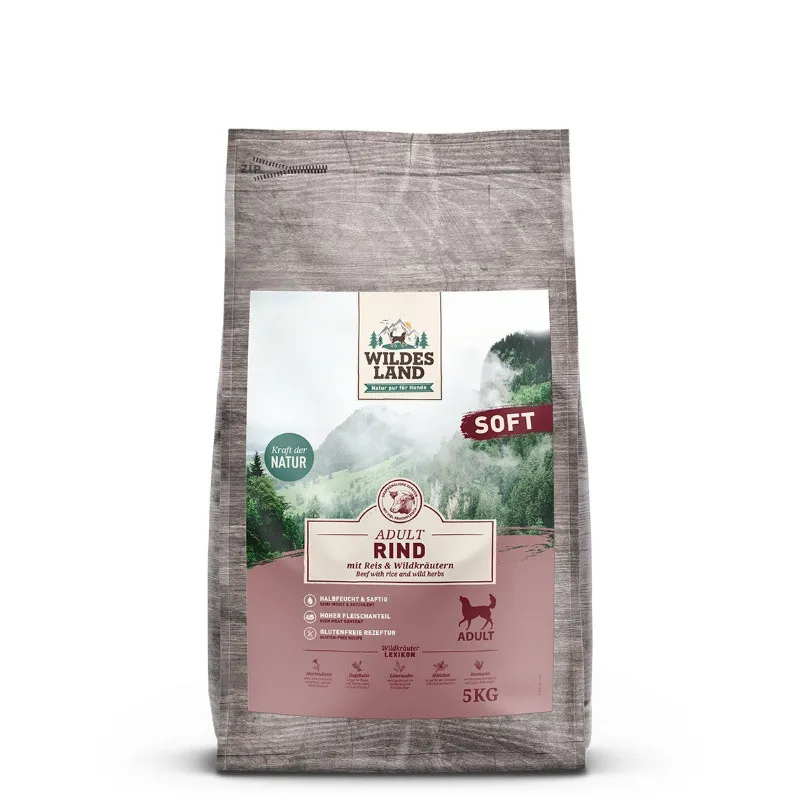 Karma Wildes Land SOFT rind - świeże mięso wołowiny z dzikimi ziołami - półwilgotna, pełnoporcjowa karma dla dorosłych psów