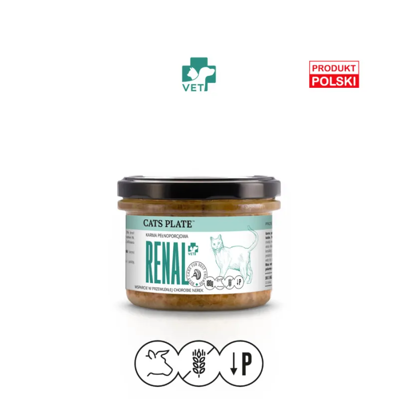 Cats Plate Vet Renal z wołowiną to specjalistyczna,pełnoporcjowa, monobiałkowa, mokra karma dla kotów z przewlekłą chorobą nerek. Opracowana przez specjalistów w oparciu o najnowsze badania dotyczące postępowania w przypadku tego schorzenia.
