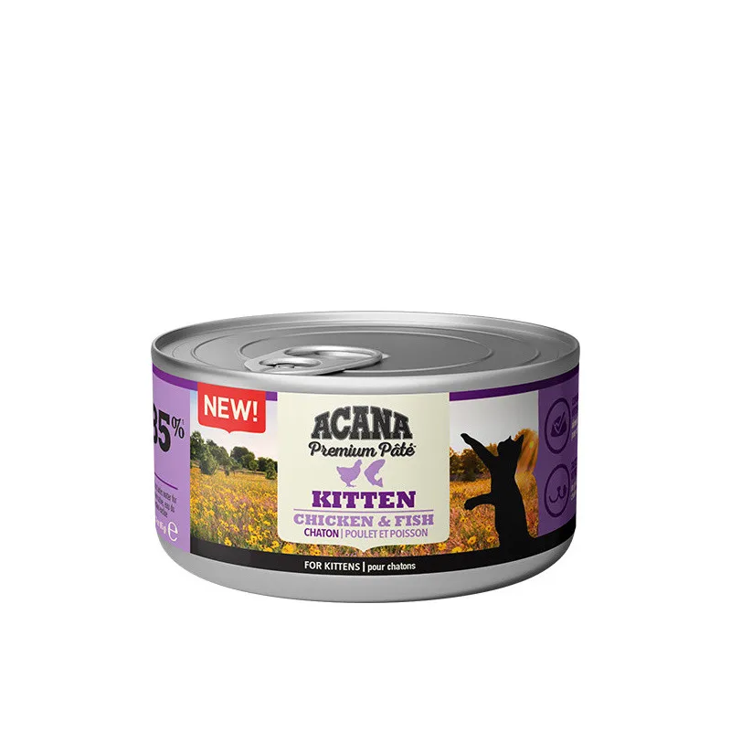 Mokra karma dla kota ACANA Premium Pate zawiera aż 85% wysokiej jakości składników mięsnych* i stanowi kompletne, pełnowartościowe jedzenie dla kotów. Dzięki smakowitym, aromatycznym mięsom zapewnia naturalny, pyszny smak, któremu nie oprze się żaden kot. Żywiąc kota mokrą karmą ACANA Premium Pate, podajesz pupilowi kompletny posiłek ze wszystkimi składnikami odżywczymi, witaminami i minerałami, których Twój kot potrzebuje, aby prawidłowo się rozwijać i pozostawać w zdrowiu. ACANA Premium Pate może stanowić podstawę diety Twojego kota (być jedyną podawaną karmą) lub być podawana wraz z suchą karmą ACANA dla kotów w mieszanym systemie żywienia.