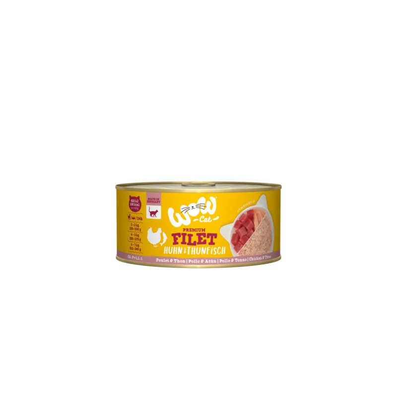 Połączenie filetów z kurczaka i tuńczyka zapewnia kotom wyjątkowe doznania smakowe. To idealny duet białek dla kotów kochających różnorodność! Poczęstuj swojego kota naszymi pysznymi filetami i ciesz się jego mruczeniem z radości! Możesz być pewien, że Twój kot otrzymuje wszystkie ważne składniki odżywcze – ponieważ filety WoW CAT pełnoporcjowe karmy i tym samym pokrywają wszystkie potrzeby Twojego kota. Naturalnie bezzbożowe i starannie wyprodukowana w Niemczech.