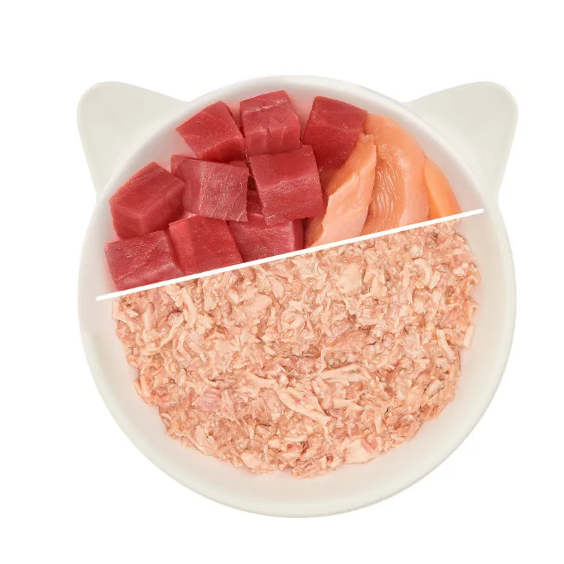 60% kurczak i tuńczyk (w tym 37% filet z kurczaka i 23% filet z tuńczyka), 37% bulion, 2% olej słonecznikowy, 1% minerały