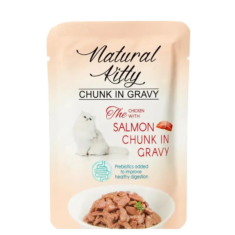 Kompletna mokra karma z prawdziwymi kawałkami kurczaka i łososia w pysznym sosie. Dostępna w wygodnym opakowaniu w formie saszetki.