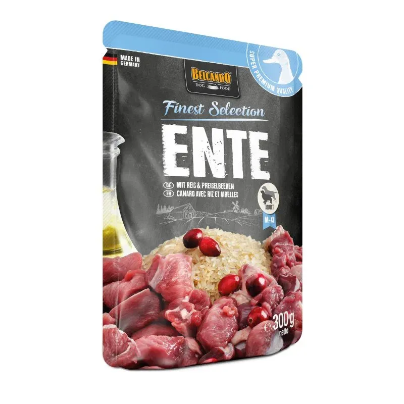 Belcando FINEST SELECTION o smaku kaczki z ryżem i żurawiną to mokra karma dla psów. Doskonałe preparaty w pojedynczych praktycznych porcjach. Soczyste mięsa, wzbogacone o wyrafinowane składniki delikatnie gotowane w całych kawałkach. Tłoczony na zimno olej osetowy dostarcza niezbędnych wielonienasyconych kwasów tłuszczowych. Niezwykle smaczna i strawna, BELCANDO FINEST SELECTION jest idealna dla psów wrażliwych lub wybrednych.