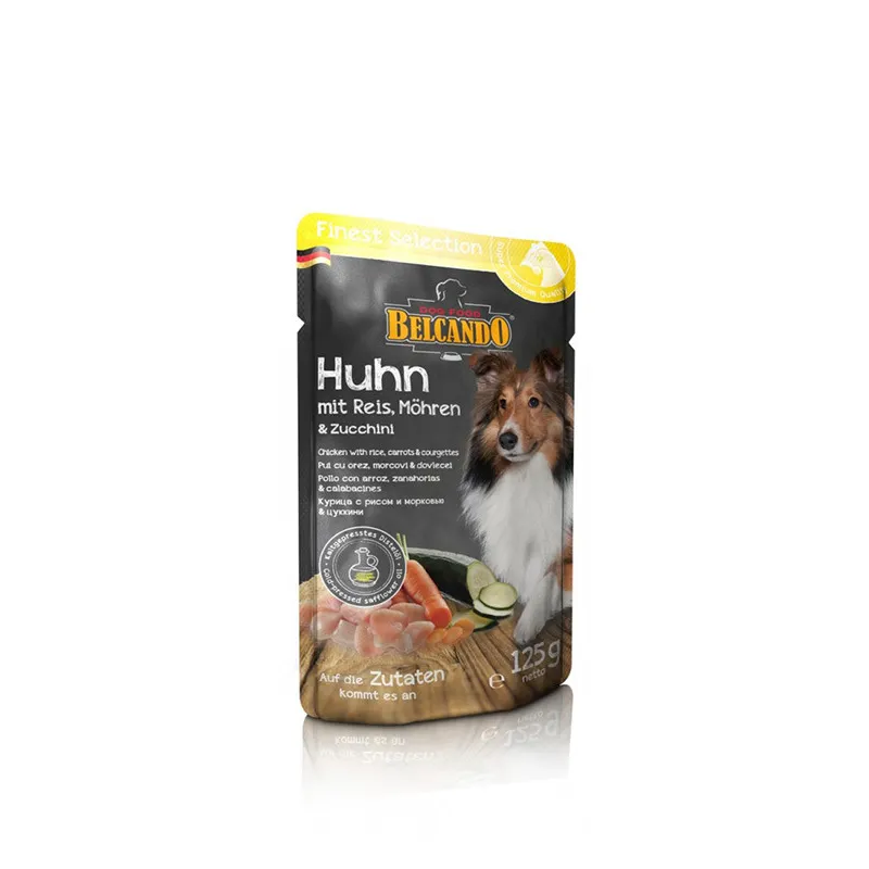 Belcando FINEST SELECTION o smaku kurczaka z ryżem, marchewką i cukinią to mokra karma dla psów. Doskonałe preparaty w pojedynczych praktycznych porcjach. Soczyste mięsa, wzbogacone o wyrafinowane składniki delikatnie gotowane w całych kawałkach. Tłoczony na zimno olej osetowy dostarcza niezbędnych wielonienasyconych kwasów tłuszczowych. Niezwykle smaczna i strawna, BELCANDO FINEST SELECTION jest idealna dla psów wrażliwych lub wybrednych.