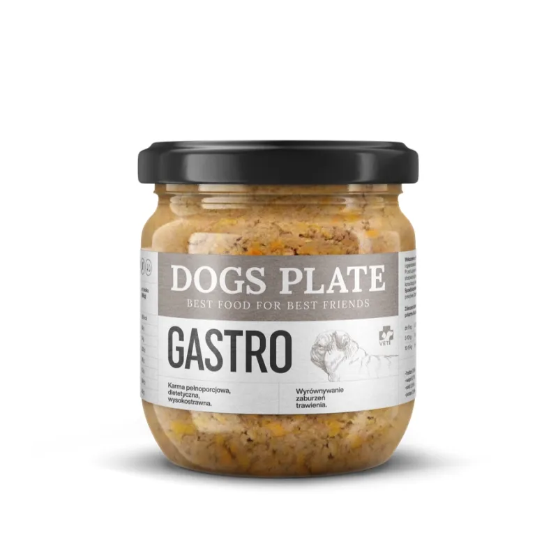 Karma Dogs Plate Vet Gastro to mokra, specjalistyczna pełnoporcjowa karma dla psów, z obniżoną zawartością tłuszczu, dla psów zmagających się z chorobami układu pokarmowego.