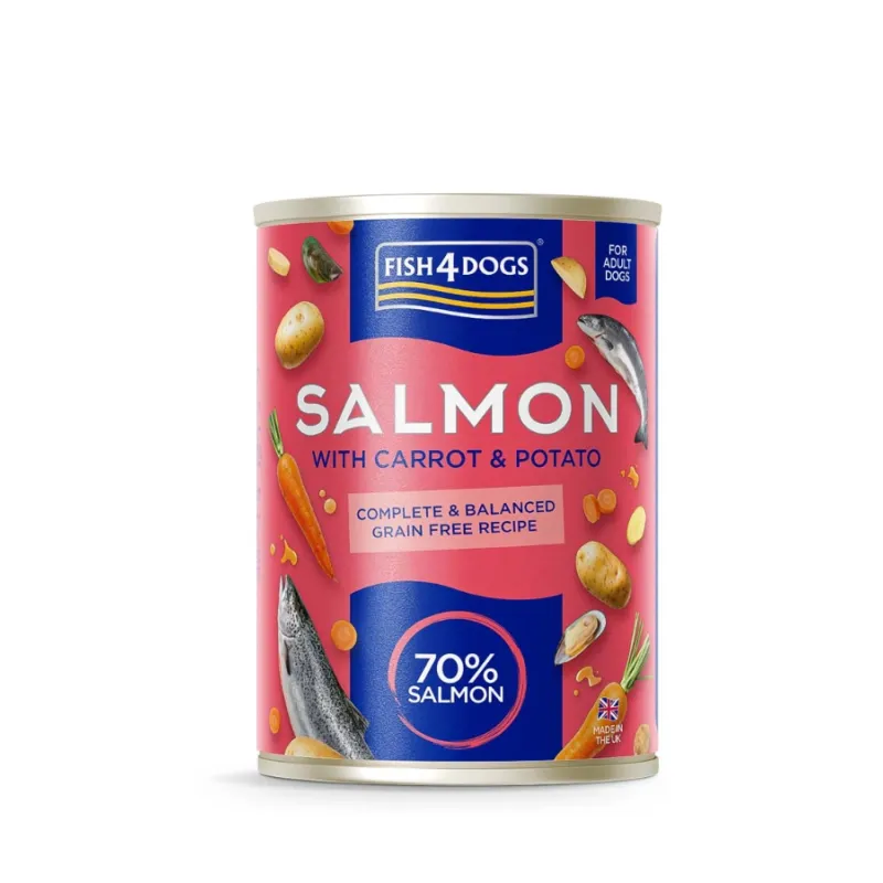 Karma mokra dla psa Fish4Dogs ŁOSOŚ z marchewką i ziemniakami to pyszna, bezzbożowa receptura, zawierająca 70% łososia, która wspiera codzienne zdrowie i ogólne dobre samopoczucie. Zawiera olej z łososia dla zdrowych stawów, skóry, a także lśniącej sierści. Ekstrakt z juki wspomaga trawienie, a zielone małże to naturalne źródło chondroityny, wspierające zdrowie stawów i ich mobilność. Jest wzbogacona w niezbędne witaminy i minerały oraz wartościowe składniki. Marchewka i ziemniaki sprawiają, że karma jeszcze lepiej smakuje i ma przyjemną konsystencję. Bez sztucznych konserwantów i barwników. Karma mokra Fish4Dogs Łosoś z marchewką i ziemniakami to pożywny, pyszny, pełnowartościowy posiłek, który Twój pies pokocha.