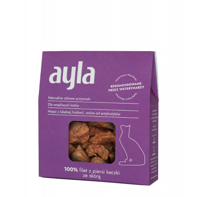 Filet z piersi kaczki jest ręcznie oczyszczany i przechodzi proces liofilizacji, dzięki któremu nie traci swojego aromatu i wartości odżywczych. Nasze przysmaki dostarczają kotom wartościowych mikroelementów, a przy tym są lekkostrawne. Stanowią idealną nagrodę pomiędzy posiłkami. Przysmaki AYLA są monobiałkowe, nie zawierają żadnych sztucznych dodatków, konserwantów czy zbóż i innych wypełniaczy. Polecane są zarówno dla kotów dorosłych jak i kociąt.
