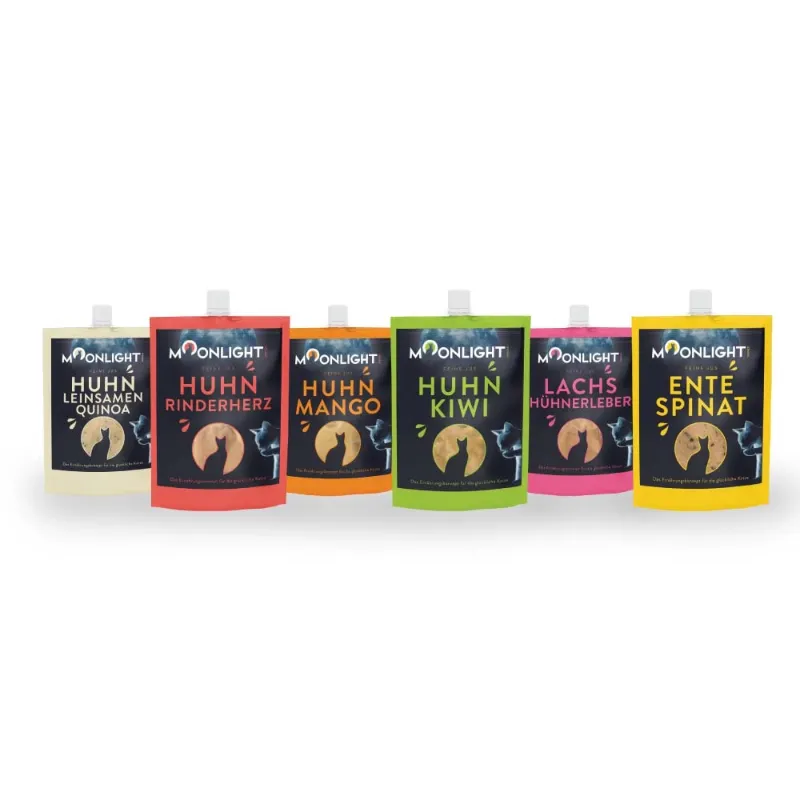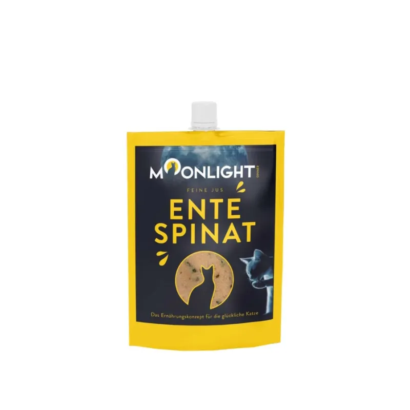Przysmaki dla kota Moonlight Dinner sos kaczka ze szpinakiem to naturalny smakołyk w pysznym sosie – połączenie smaku i zdrowia! Lekkostrawny dodatek do codziennej diety, który łączy aromatyczny bulion z kurczaka z delikatnymi kawałkami mięsa z kaczki i szpinakiem. Stworzony z myślą o najbardziej wybrednych kocich smakoszach! Ten przysmak nie tylko rozpieszcza podniebienie, ale także wspiera zdrowie i dobre samopoczucie Twojego kota.