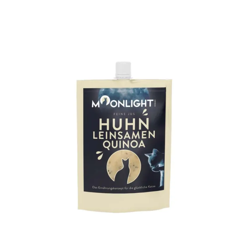 Przysmaki dla kota Moonlight Dinner Sos Kurczak z Siemieniem Lnianym to naturalny smakołyk w pysznym sosie – połączenie smaku i zdrowia! Lekkostrawny dodatek do codziennej diety, który łączy aromatyczny bulion z kurczaka z delikatnymi kawałkami mięsa i siemieniem lnianym. Stworzony z myślą o najbardziej wybrednych kocich smakoszach! Ten przysmak nie tylko rozpieszcza podniebienie, ale także wspiera zdrowie i dobre samopoczucie Twojego kota.
