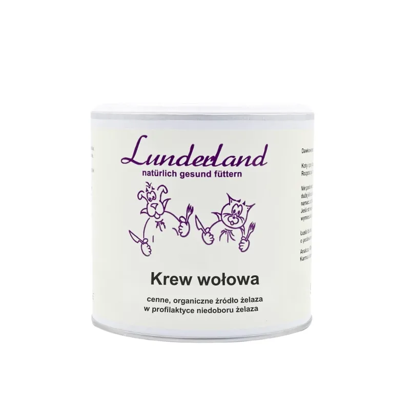 Lunderland suszona krew wołowa to 100% suszonej krwi wołowej bez dodatków. Naturalnie dostarcza organicznego żelaza oraz bardzo wysokiego poziomu białka, dlatego dobrze uzupełnia dietę psów i kotów opartą na mięsie.