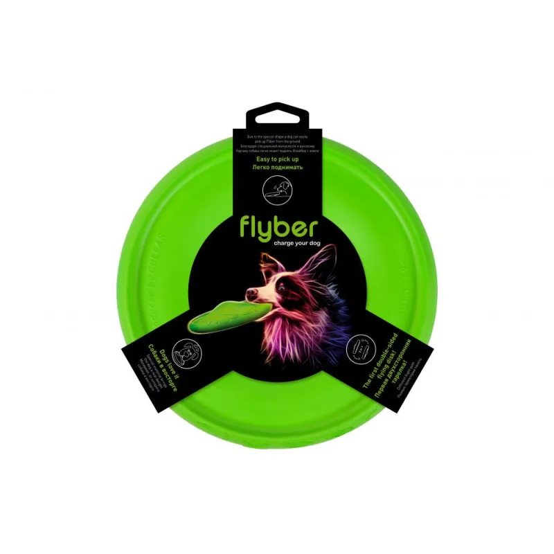 Optymalny rozmiar, wyjątkowy kształt i tworzywo sprawia, że jest to idealna zabawka dla większości psiaków. W przeciwieństwie do sportowych dysków, Flyber-a można przygryźć i nie uszkodzi on delikatnego wnętrza psiej paszczy. Profilowanie dysku sprawia, że łatwo podjąć go z podłoża. Środkowa część dysku tworzy kopułę, przez co lecący dysk zawiśnie w powietrzu, a po skończonej zabawie może posłużyć jako miseczka do napojenia psa. Warto wspomnieć o rancie dysku wysokim na 1cm i występującym po obu stronach Flyber-a.